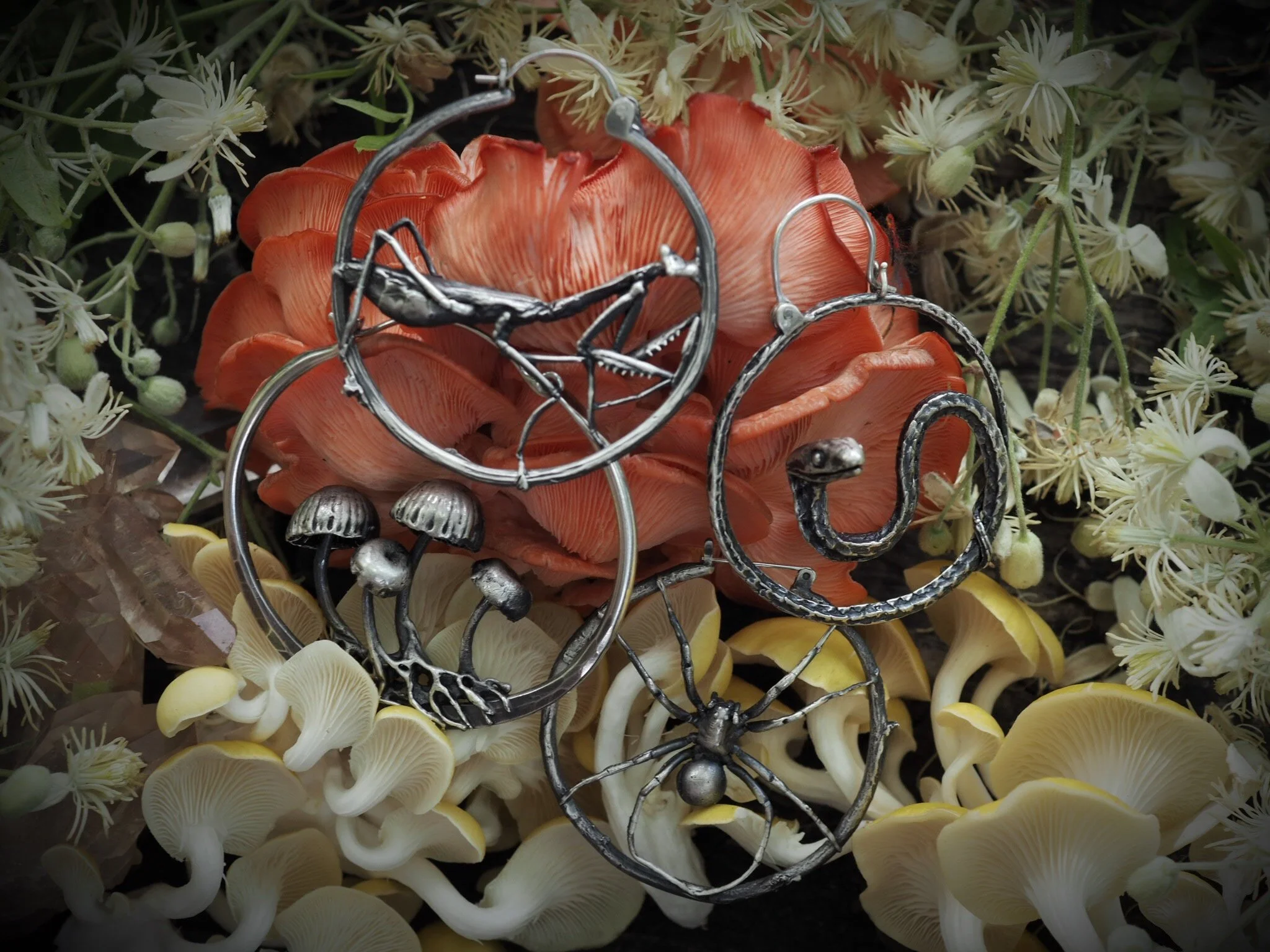 Earrings shown here: Mushroom, Wolf Spider, Snake and Praying Mantis Hoop Earrings